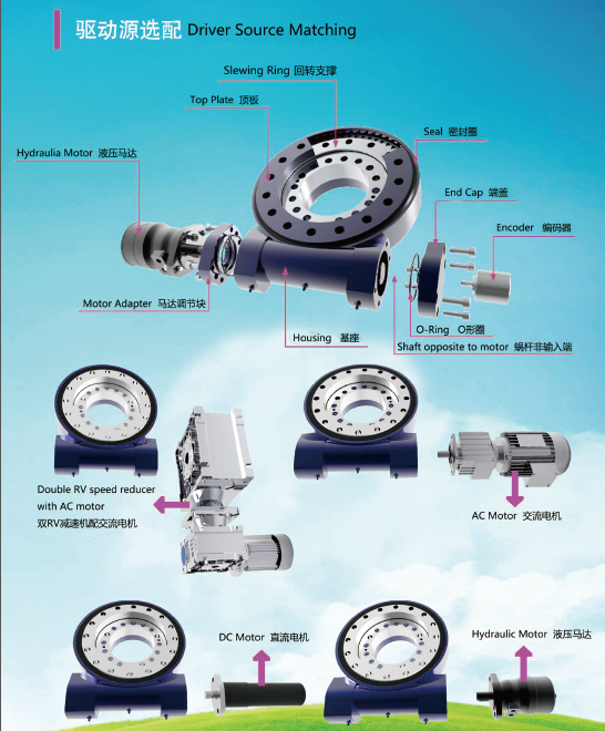 回轉減速機及開式齒輪或銷輪組成。為了在事故停電時仍能旋轉,還設備了備用電源或其他動力系統。采用直流電機驅動時,停電時可用蓄電池供電。采用交流電機供電時,停電時可用液壓或氣動馬達驅動。大型回轉臺多采用雙電機驅動,當一臺電機發生故障時,另一臺電機能在允許的_負荷狀態下正常運轉。