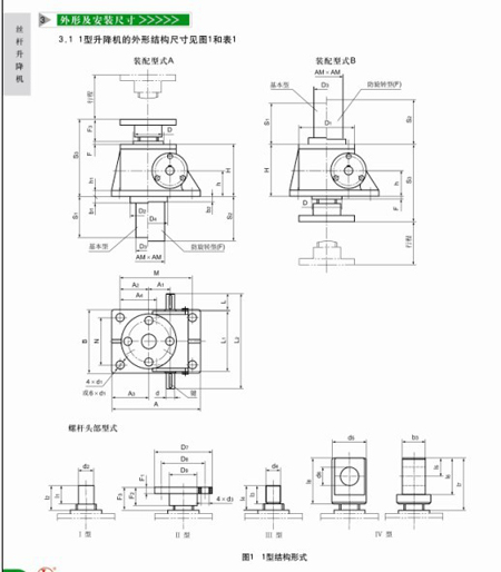 SWL蝸輪絲桿升降機結構型式分為1型-蝸輪與螺桿為螺紋聯(lián)接,螺桿作軸向運動;2型-蝸輪與螺桿為鍵聯(lián)接,螺桿上配螺母,螺桿上的螺母作軸向運動。螺桿頭部型式分為Ⅰ型(圓柱型)Ⅱ型(法蘭型)Ⅲ型(螺紋型)Ⅳ型(扁頭型)。