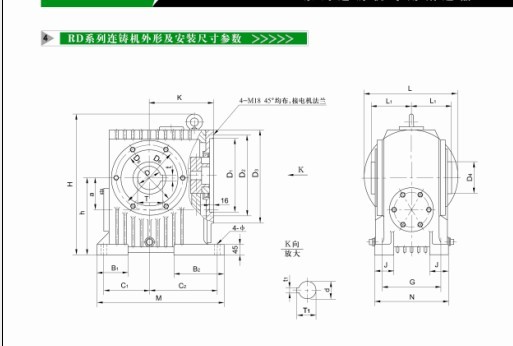 RD系列減速機是冶金行業(yè)雜軋鋼機組中拉矯機,引錠桿存放裝置及振動裝置專用的二次包絡(luò)蝸桿減速機。引進美國羅可普公司(ROKOPCO/U.S.A)_技術(shù)生產(chǎn),采用軸裝是結(jié)構(gòu),易于同工作機械相聯(lián),箱體采用樹脂砂鑄造,結(jié)構(gòu)緊湊,外形美觀,傳動比可隨用戶要求而變。