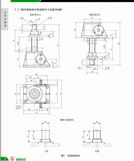 SWL蝸輪絲桿升降機2型結構為蝸輪與螺桿為鍵聯接,螺桿上配螺母,螺桿上的螺母作軸向運動。螺桿的頭部型式為Ⅰ型(圓柱型)和Ⅲ型(螺紋型)兩種。