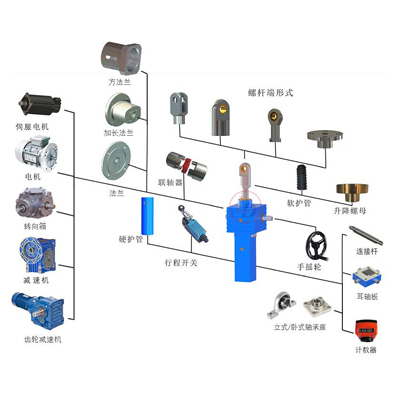 可以直接與電機、減速電機、特殊功能附件的任意組合,一體化設計,為客戶提供上千種的選擇。可以按照客戶要求非標設計,可裝配防塵罩,反齒隙設計,安全螺母,滾珠絲杠,限位開關,過載離合器,電位計,編碼器,制動器,手搖把,安裝附件等。
