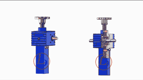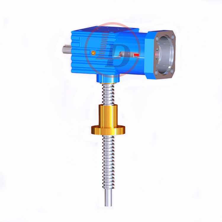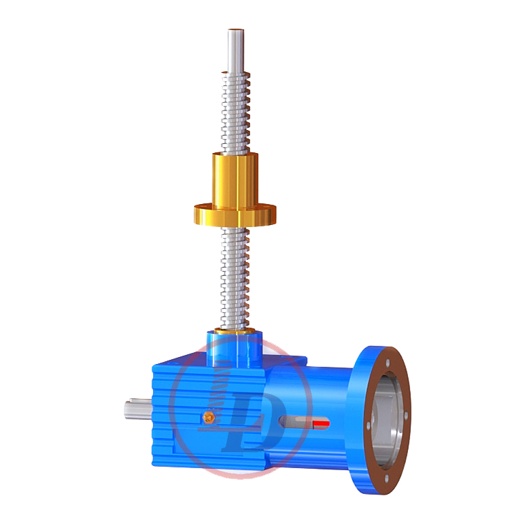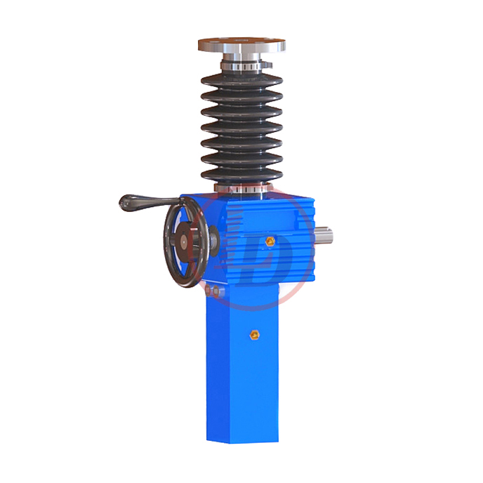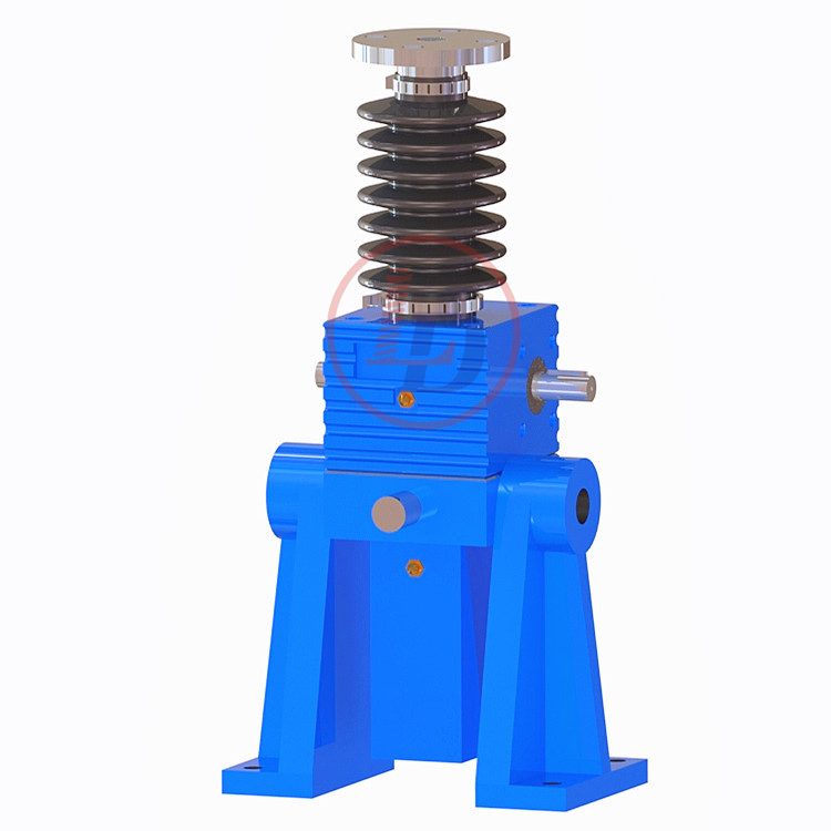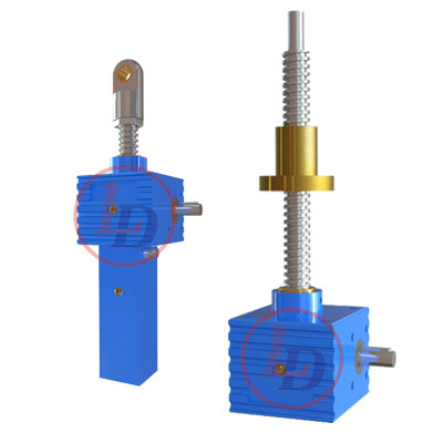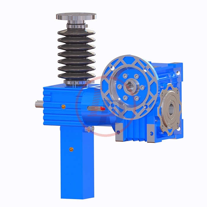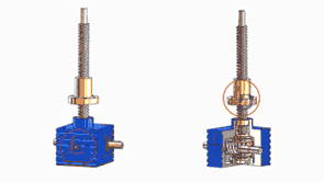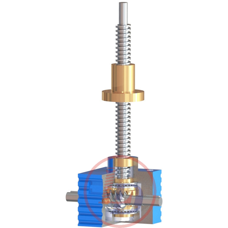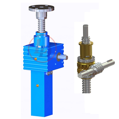 的原理為蝸桿驅動蝸輪旋轉,蝸輪中間為內螺紋孔機構(與絲杠相嚙合),再將旋轉運動傳遞至絲杠上下直線運動。